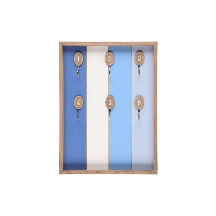 Merihenkinen avainnaulakko. Ulkopuoli luonnollisen puun värinen, sisäpuolelta sinivalkoinen. Kuusi numeroitua avainkoukkua. Koko 30 x 3 x 40 cm.