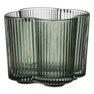 Vihreän lasilyhdyn pinnassa kulkee pystysuuntaisia uurteita, jotka tuovat eloisuutta ja korostavat lasin läpikuultavuutta. Lyhdyn epäsäännöllinen, aaltoileva muoto ja neljä kaarevaa sivua tekevät siitä veistoksellisen ja persoonallisen sisustuselementin. Soveltuu lämpökynttilöille ja pienille LED-kynttilöille. Koko 8,5 x 8,5 x 7,7 cm.