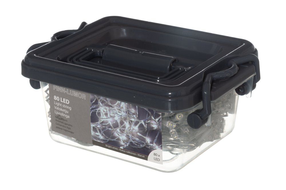 80 kpl kylmä valkoinen LED, 3V 0,06W. Ledit 10 cm välein. Läpinäkyvän johdon pituus 5 m. Pakattu kestävään säilytysrasiaan. Muuntaja 220-240V 50-60Hz 300mA, 3,2V 50Hz, 0,96W, IP44. Sisä- ja ulkokäyttöön.