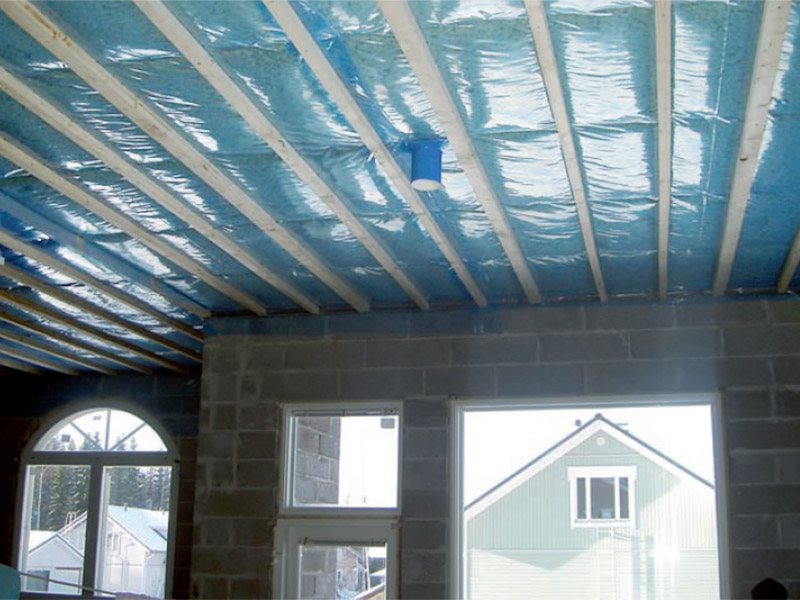 Sinertävä kalvo lämmöneristeen sisäpuolelle estämään ilmavuodot ja haitallisen kosteuden kertymisen.