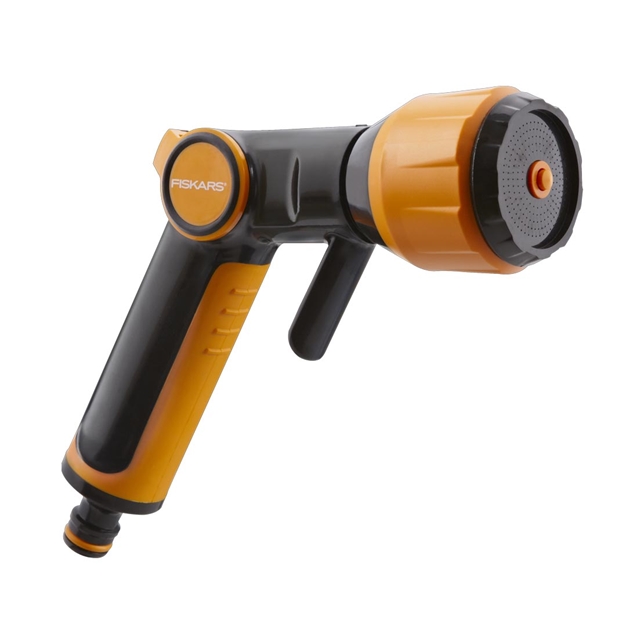 Fiskars multi kastelupistooli eri suihkutoiminnoilla.