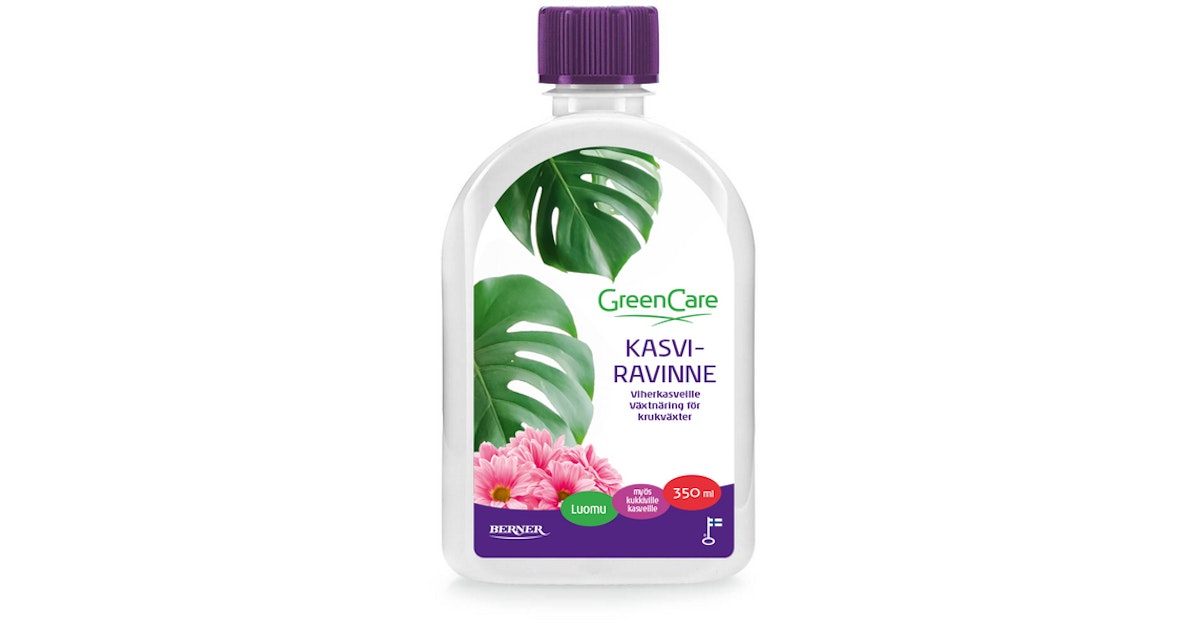 Riittoisa kasviperäinen ravinneliuos kaikkien huonekasvien luonnonmukaiseen hoitoon. Greencare kasviravinne saa viherkasvit kasvamaan rehevästi ja kukat kukkimaan upeasti. Se sisältää runsaasti ravinteita ja on hajuton. Ei sisällä vinanssia. Ravinnetta voi tarjoilla kasveille koko kevään ja kesän. Pakkauskoko 350ml.