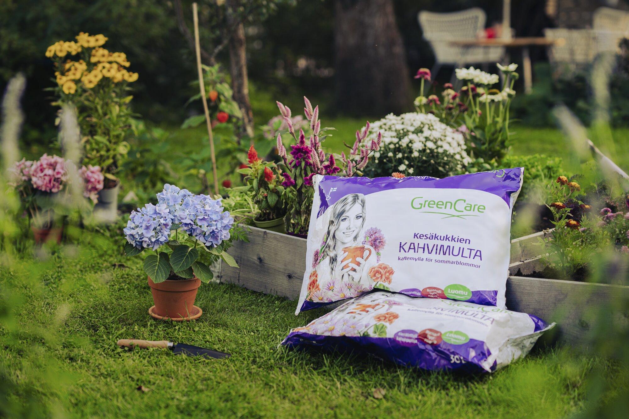 Isoäidin kukkaloisto omaan puutarhaan! Kahvimulta on tumma ja täyteläinen ruukutusmulta kaikille kesäkukille. Valmistuksessa on hyödynnetty käytettyjä kahviporoja, jotka on kerätty suomalaisista kahviloita.