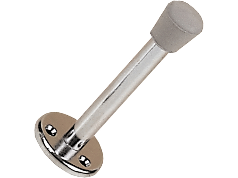 Teräksinen ovenpuskin seinään tai lattiaan. Sinkitty teräs. Paksuus 10mm, pituus 60mm.