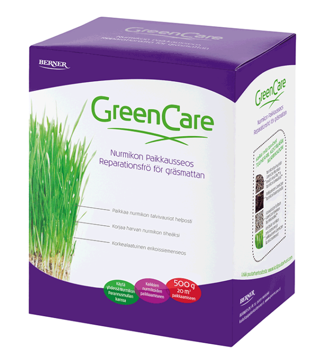 Greencare Paikkausseos on nurmikon talvivaurioiden korjaukseen tarkoitettu siemenseos. Se auttaa harventuneen nurmikon kasvua tiheämmäksi. Siemenseos sisältää punanataa, joka on helppohoitoinen sekä kestää hyvin kuivuutta, Viherpeittävyyttä lisää puistonata ja niittynurmikka takaa kestävän nurmen myös pelaamiseen sekä westerwordin raeheinää nopeaan itämiseen. Käyttöluokka 1. Haravoi maan pinta näkyviin ja poista kuollut nurmikko, tasoita paikattavat kohdat mullalla, tiivistä kasvualusta nurmikkojyrällä tai kevyesti tallaamalla. Kylvä paikattava kohta nurmikon paikkausseoksella, lisää lopuksi ohut kerros multaa päälle ja kastele. Pidä mullan kosteus tasaisena niin kauan kun ruoho on vähintään 3cm.