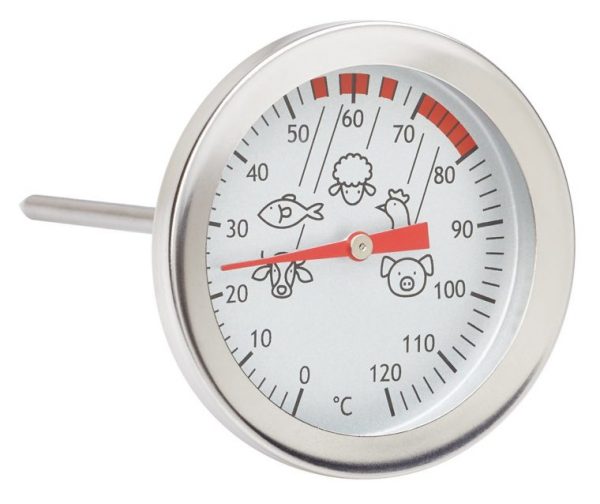 Pyöreä paistilämpömittari on valmistettu ruostumattomasta teräksestä. Mittariin on painettu ohjeelliset paistolämpötilat eri lihalaaduille. Aseta mittari paistoksen keskelle niin että se ei koske luuhun.