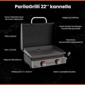 ParilaGrilli 22 tuumaa on varustettu vaikuttavalla 7,03kW:n teholla, joka takaa nopean ja tehokkaan ruoanvalmistuksen. Kahdella itsenäisellä lämpövyöhykkeellä voit säätää lämpötilaa eri alueilla ja valmistaa erilaisia ruokia samanaikaisesti. Lisäksi grillissä on patentoitu takapään rasvanhallintajärjestelmä, joka helpottaa puhdistusta ruokailun jälkeen.