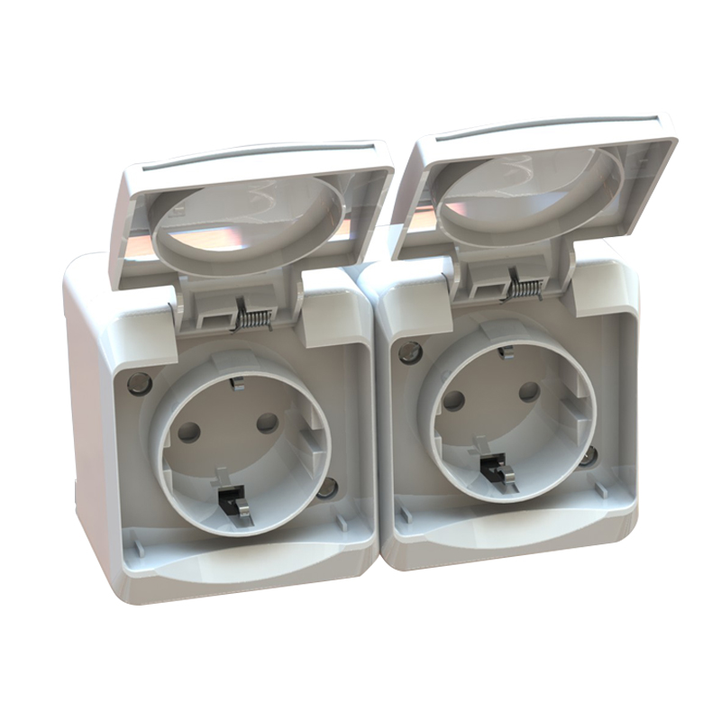 2-osainen OPAL PRO maadoitettu ja pinta-asenteinen pistorasia. Kotelointiluokka IP44, 16A / 250V.