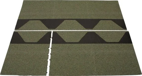 Kumibitumilla kyllästetty räystäs-/harjalevy. Päällystetty värillisellä sirotteella. Paketilla saa tehtyä joko 10m harjaa tai 10m alaräystästä. Harjalla levyt limitetään, alaräystäällä asennetaan puskuun. Väri metsänvihreä.
