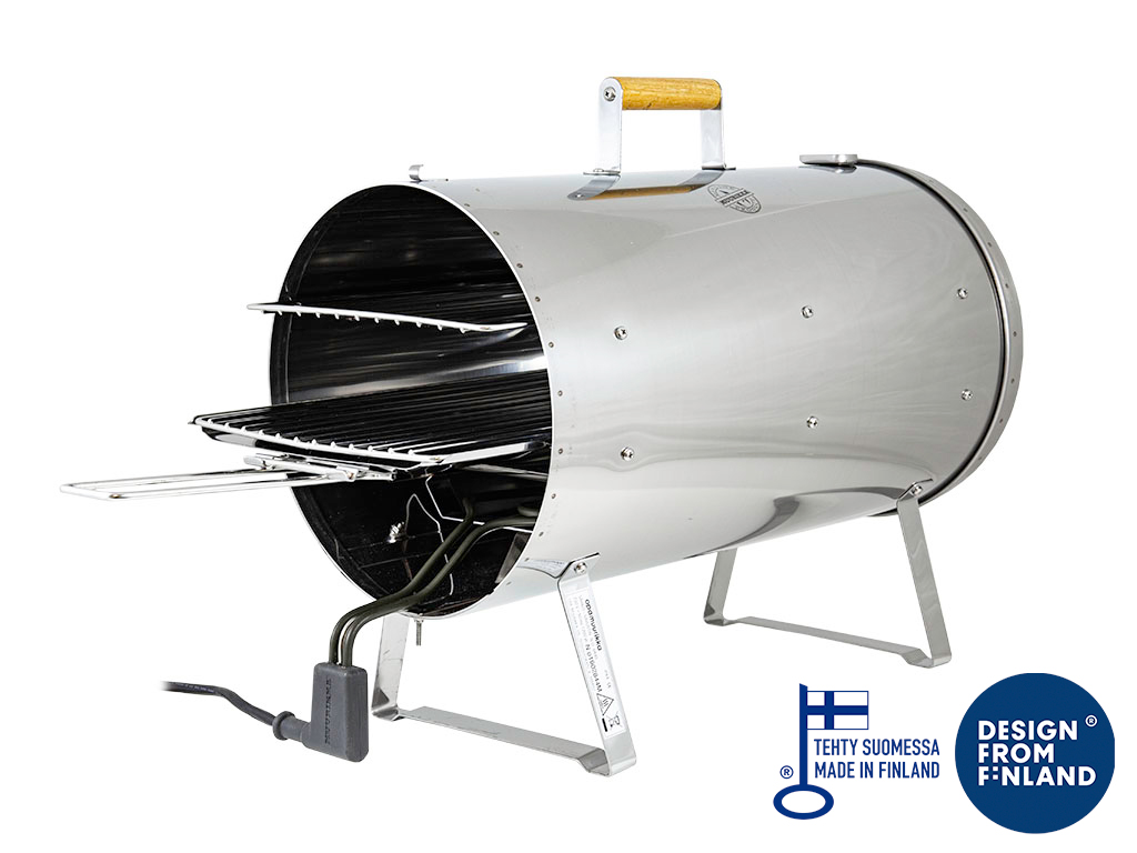 Muurikka-sähkösavustin toimii savustuspuruja käyttämällä heti valmiina savustimena ja ilman puruja pihauunina ympäri vuoden