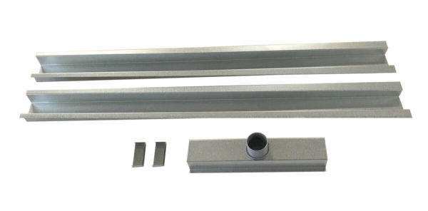 Asennus on helppoa. 2 kpl sopivaksi lyhennettyä lattiakourua asennetaan lattiaan tukipuiden varaan ja väliin asennetaan liitoskappale, josta vesi johdetaan 75mm viemäriputkeen. Kourun pituus säädettävissä portaattomasti kourua lyhentämällä 1600 – 3400mm väliltä.