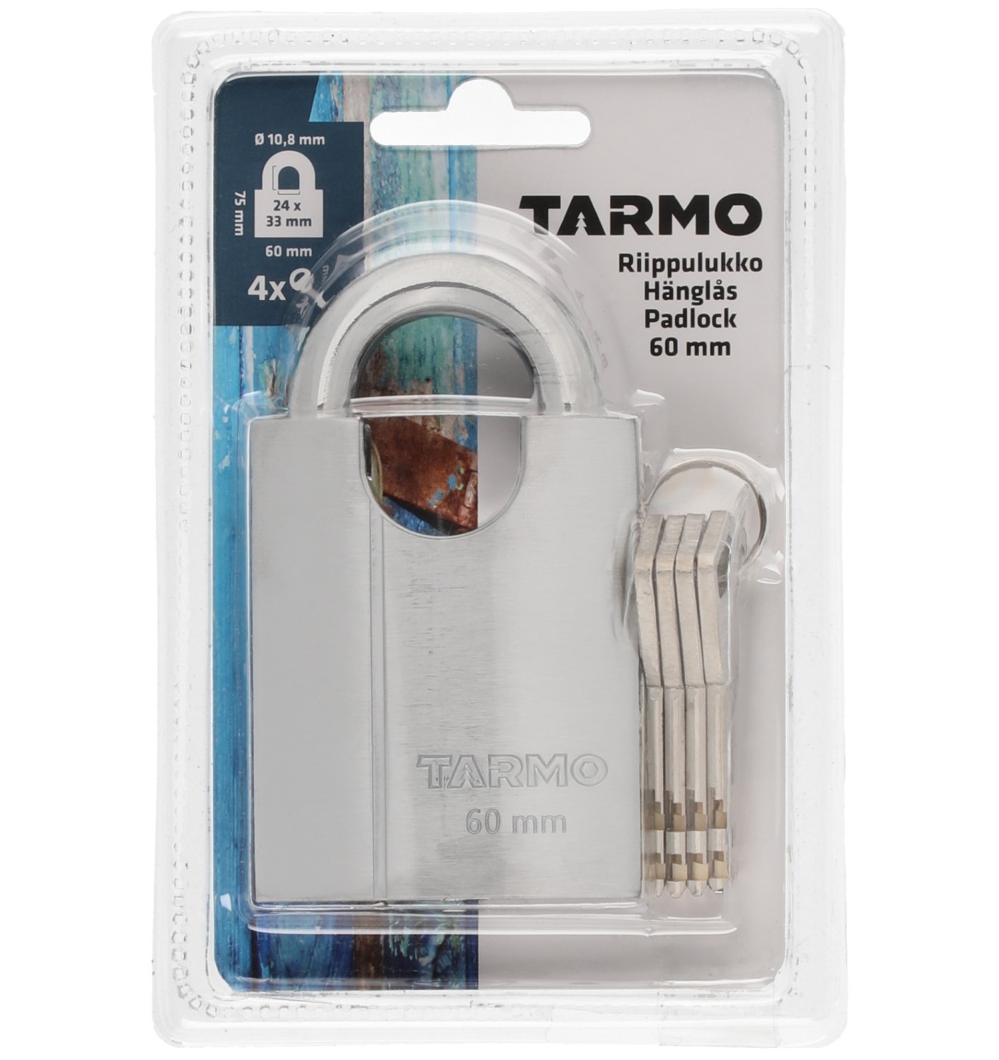 Riippulukossa erikoisvahva sanka ja sangan suojaus ylös asti. Kromattu messinkirunko ja messinkinen sylinteri.