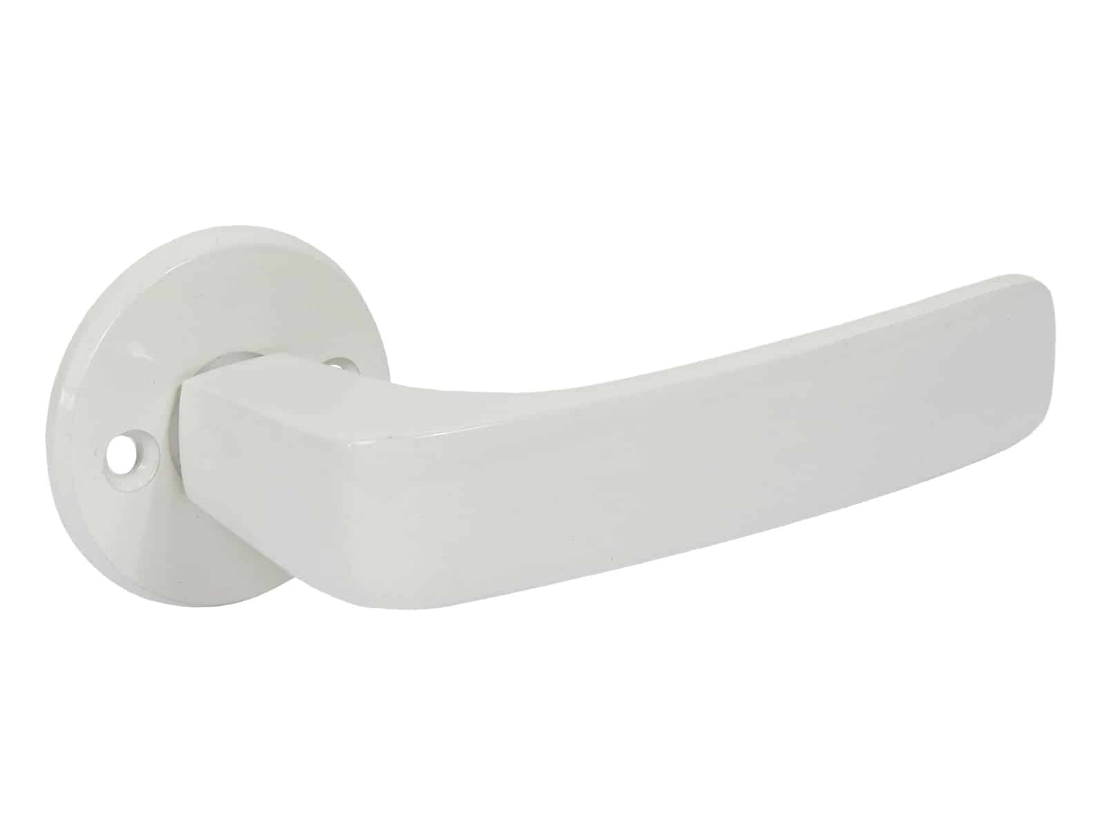 Perinteinen ulko-oven painike. Messinkiä, valkoinen. Palautusjousella. Painikkeen pituus 109mm. 40-60mm paksuihin oviin.