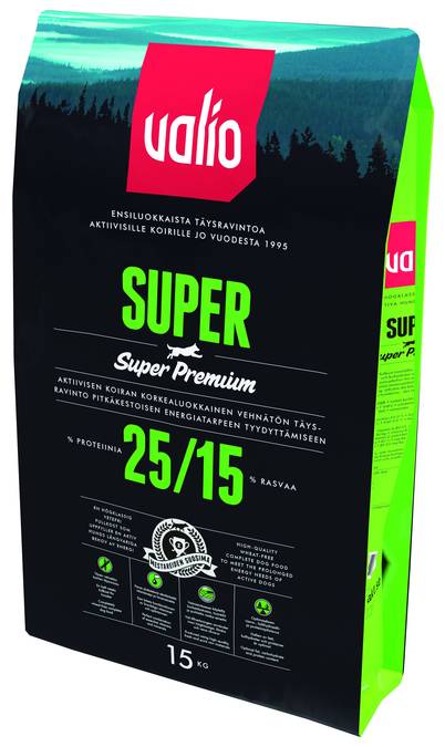 Valio Super on hyvin imeytyvä täysravinto kaikille koirille, ja se sopii normaaliaktiivisten ja normaalipainoisten aikuisten koirien energiatarpeeseen. Sisältää 25% proteiinia ja 15% rasvaa. Valio Super -koiranruoan pääproteiininlähteinä ovat hyvin sulava kuivattu kananliha sekä kuivattu kala. Hiilihydraatteina ruoassa ovat riisi ja maissi. Ruoan sisältämä vitamiinien ja hivenaineiden yhdistelmä edistävät koiran hyvinvointia ja tukee ihon ja turkin terveyttä. Ruoka ei sisällä keinotekoisia väri- tai säilöntäaineita, eikä geenimanipoloituja ainesosia ja se on säilötty luontaisilla antioksidanteilla ja vitamiineilla. Valio Super -koiranruoka on vehnätöntä ja soijatonta. Koiranruoan valmistusaineet: kananliha 44%, maissi, riisi, kananrasva, juurikaskuitu, kuivattu kala, johanneksenleipäpuun hedelmä, panimohiiva, pellavansiemen, hydrolisoitu kananmaksauute, mineraaleja, vitamiinejä ja lesitiiniä.